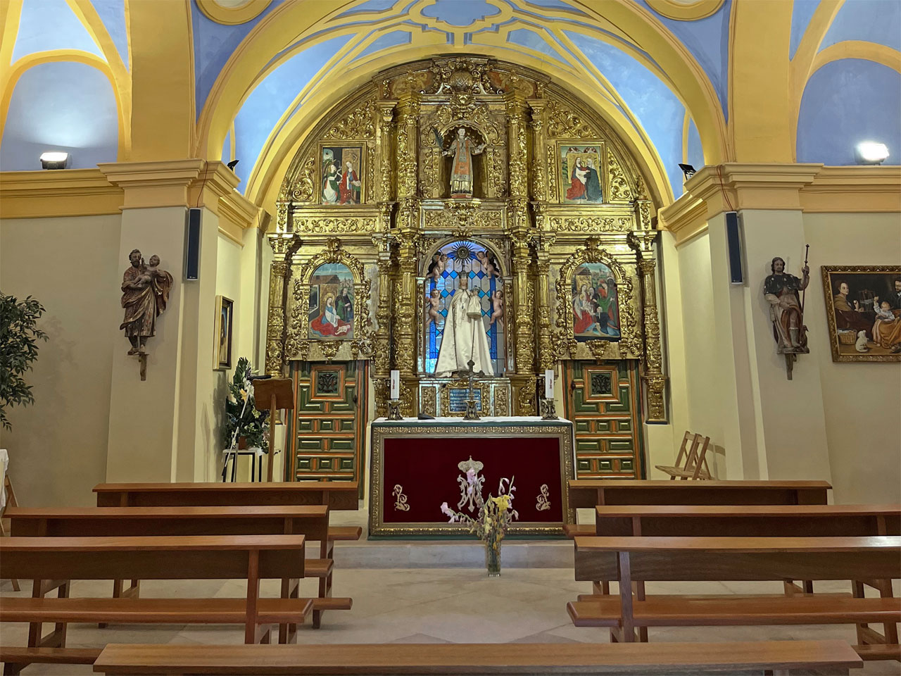 En el presbiterio, retablo de zócalo, cuerpo y ático redondo, en tres calles, con balaustres y hojarasca, barroco de la primera mitad del siglo XVIII.